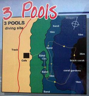 Der Einstieg erfolgt auch hier von Land. Man durchtaucht ”Three pools”, die jeweils eine Tiefe von 3 m haben, bevor es zu einem wunderschönen Korallengarten geht, in dem es eine Vielzahl von Unterwassertieren (Skorpion-Fisch, Röhrenwurm, Drückerfisch...) zu sehen gibt.